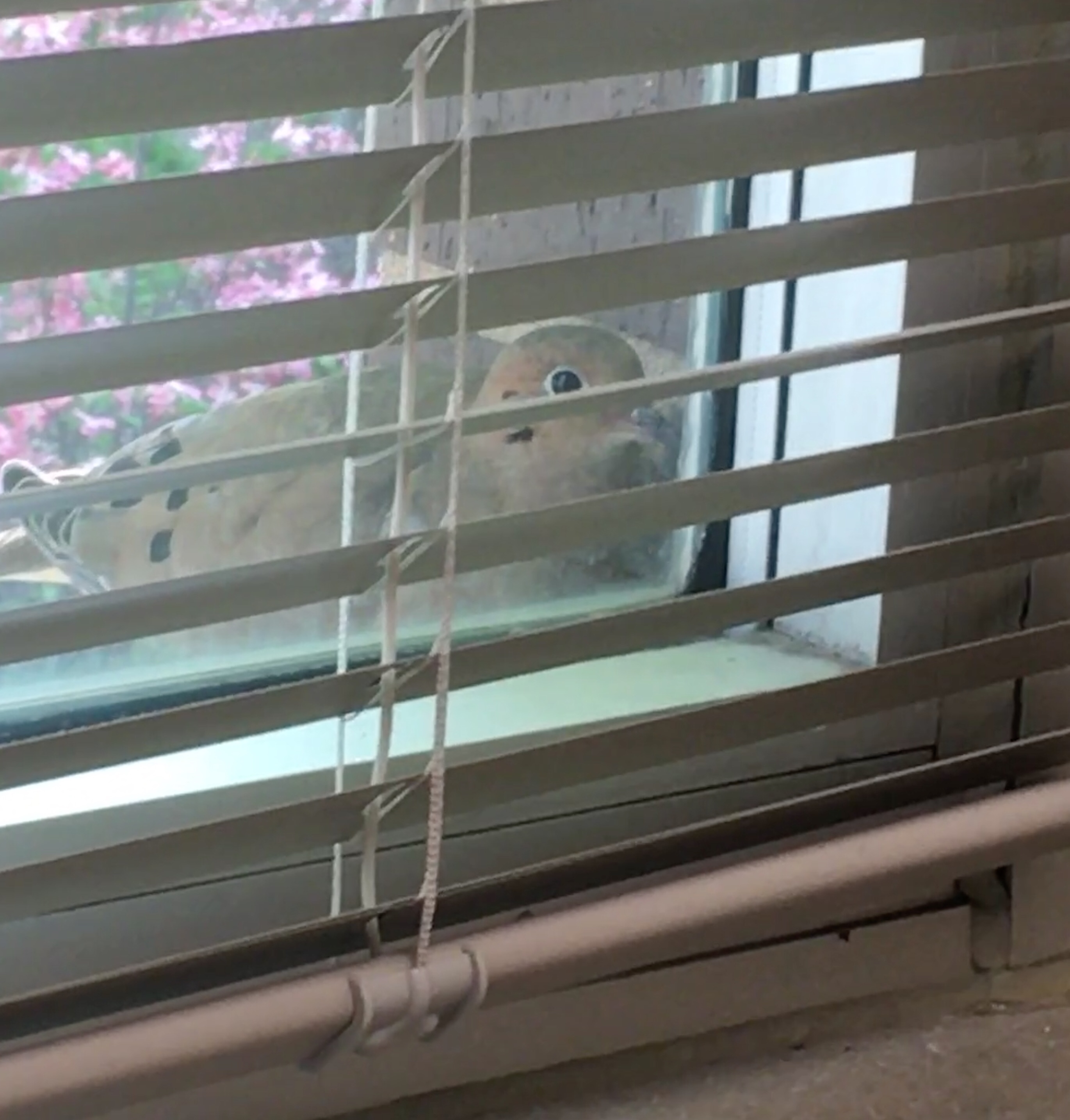 This morning, something caught my eye. A large bird flew up to the window and then took off. I instantly knew it was not one of the doves, but it was so fast that I couldn’t tell what kind of bird it was. I looked at the nest and did not see a dove, in fact, it looked like a very small bird cowering in the nest trying to be invisible. This was the first view of the nest without an adult.