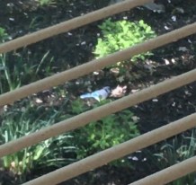 From the red shape under the blue jay and the rapid downward action of the beak, it was easy to know what was going on. That was a chilling scene, but something that happens often in the animal kingdom. That would be horrific for a child to see, and not much better as an adult.