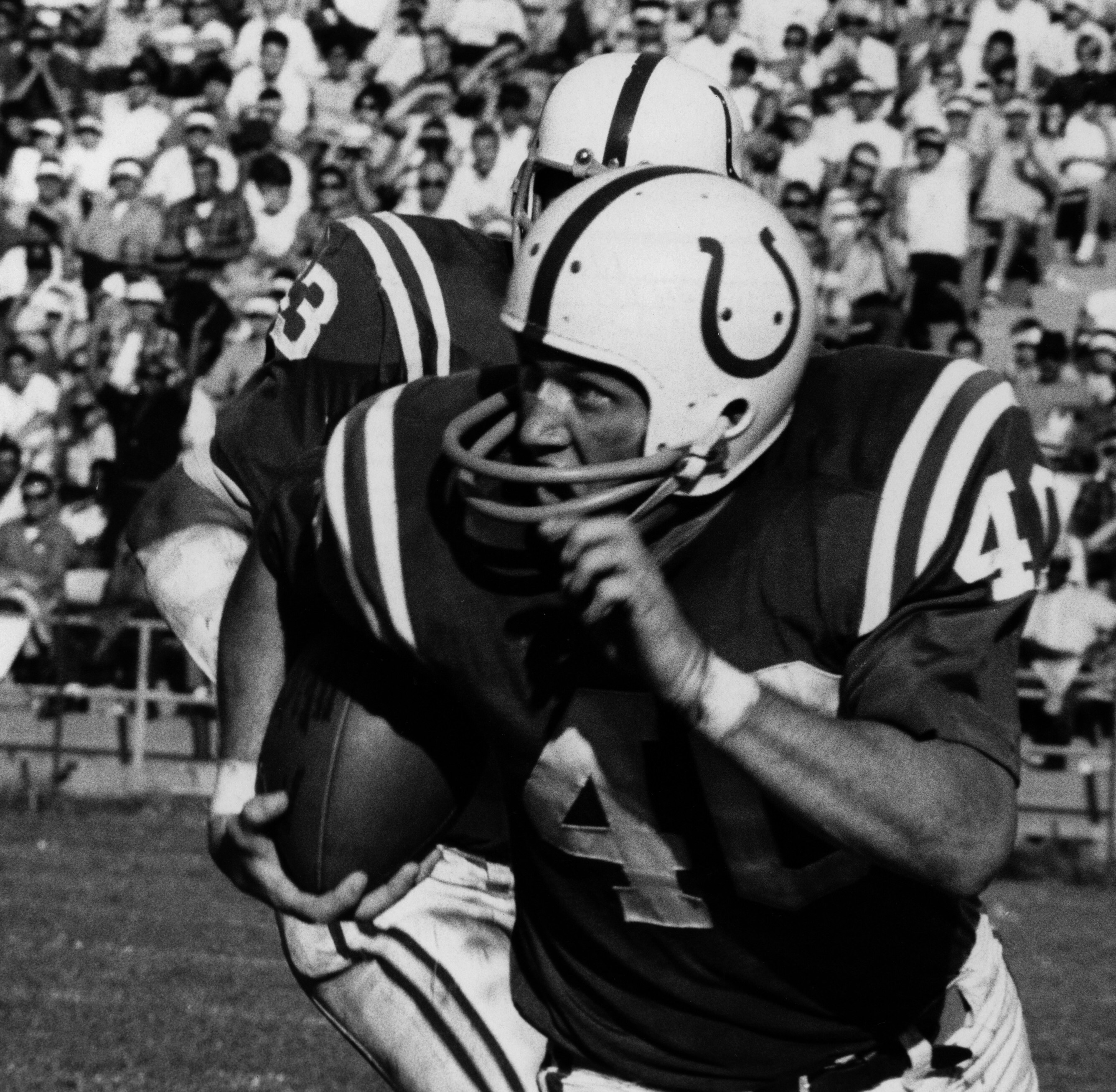 Tom Matte was a reluctant quarterback for Woody Hayes at Ohio State. Hayes moved him to quarterback and Matte became an All-American, although he did not throw the ball much. Drafted by the Colts in 1961, Matte played halfback. In 1965, both quarterbacks were injured and head coach Don Shula turned to Matte. The offense was changed to fit a mostly running quarterback. Matte played two regular season games and one playoff game at quarterback. The next season he gladly returned to running back until he retired after the 1972 season. Matte called himself a Jack of all trades but a master of none. He wasn’t particularly big or fast, but he had soft hands, blocked well and was very effective running the sweep.