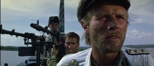 Irishman Murphy was on a British ship torpedoed by the German submarine off the coast of Venezuela during the final days of World War II. The Germans machine gun Murphy’s crew trying to escape their sinking ship. Only Murphy, a seaplane mechanic, survives and is picked up by Louis coming by on his oil company barge.  No explanation is really given for the Germans killing the helpless sailors, unless it is to keep anyone from knowing the location of their submarine. Venezuela was generally neutral during the war, but it’s oil resources were of great interest to both sides. A German submarine being able to operate undetected on inland waters would be worth keeping secret.
