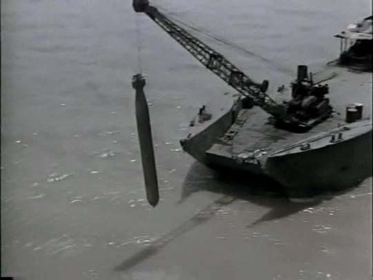 Murphy figures out how to work the barge crane and heads back out to where the submarine submerged.