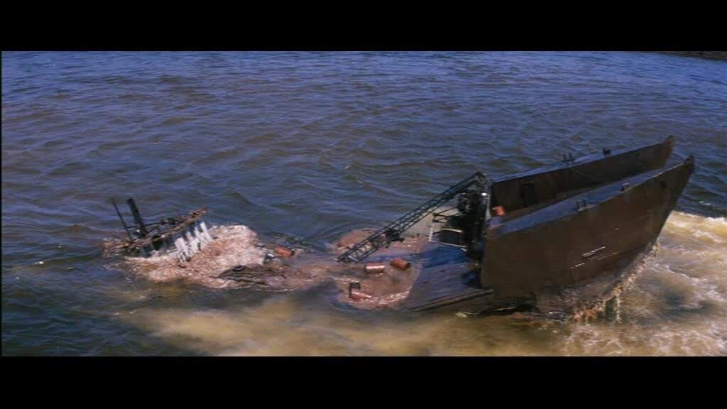 The explosion has caused the barge to rock and the crane to fall on Murphy. As the barge begins to break up and begin to sink, Murphy struggles without success to free himself, disappearing beneath the surface as the barge sinks out of sight.  The sinking of the barge is quite spectacular, with no CGI effects.