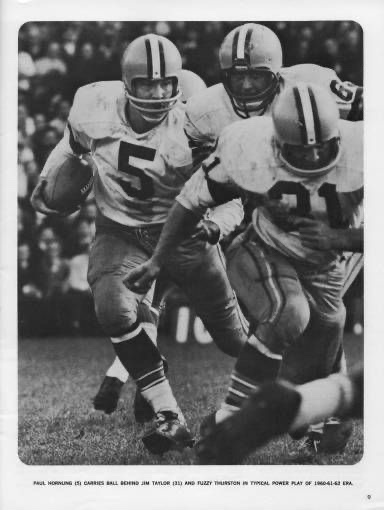 Fullback Jim Taylor (31) blocks for halfback Paul Hornung (5).