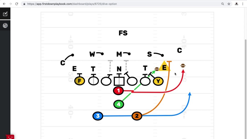 The Wishbone formation. The quarterback (1) can hand it off the the fullback (4) or toss it to either halfback (2, 3), or keep the ball and follow his backs who block for his run.