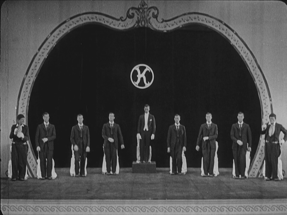 In his second year as a film lead, he came up with The Playhouse (1921), another two-reeler, but what a leap forward. Keaton and his cameraman Elgin Lessley figured out how to keep parts of the film unexposed so that he could be accompany himself in the frame. In all, Keaton was 26 different characters, appearing as nine separate people onstage at the same time, and other shots of being two or more characters. Keaton in short order was not only presenting entertaining stunts, but also creatively pushed the bounds of filmmaking.