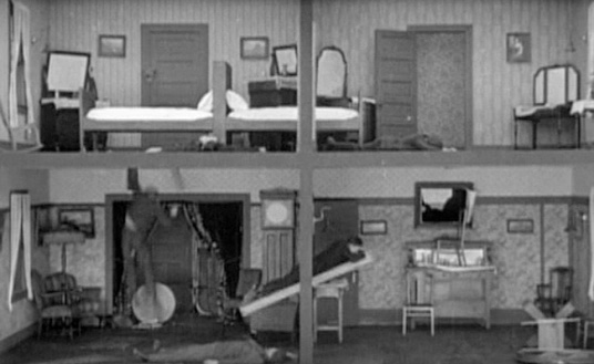 Keaton’s first independent short film. A newlywed, he and his bride are given a house – which they have to assemble. The house from hell. A mix up with the instructions and they build it incorrectly, resulting in a cockeyed structure that ends up a disaster with a train demolishing their house.