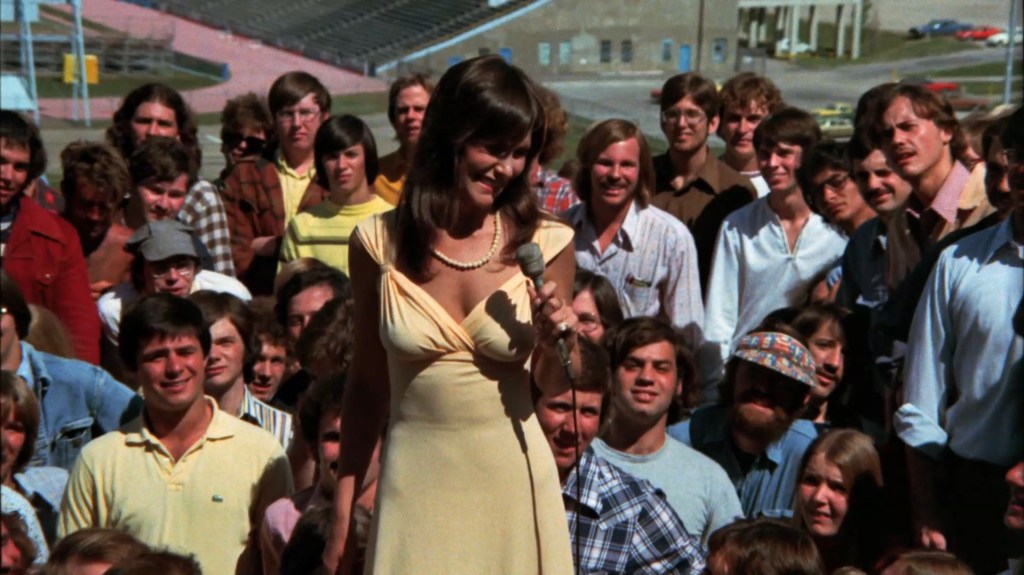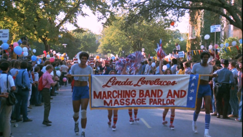 The reason that Linda Lovelace for President was must-see for my friends from Lawrence, KS is for the parts that were filmed there. I recall the hoopla when production took place in 1974, and the bit of controversy regarding filming. The city initially approved, then refused permission to hold a parade and to film a gathering at a downtown park. The school district also refused permission for the high school marching band to be included.