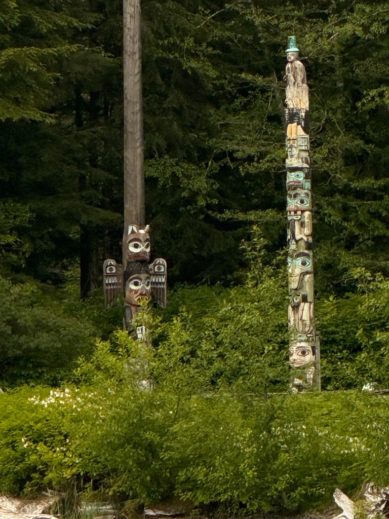Also present were an array of totem poles. One expects to see the colorful and detailed poles across the state. They are unique and highly visual. Even from our boat we could see the detailed carvings.