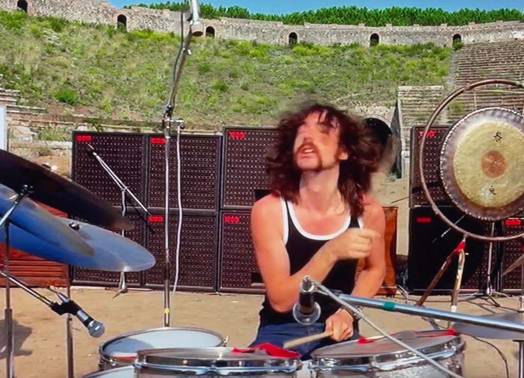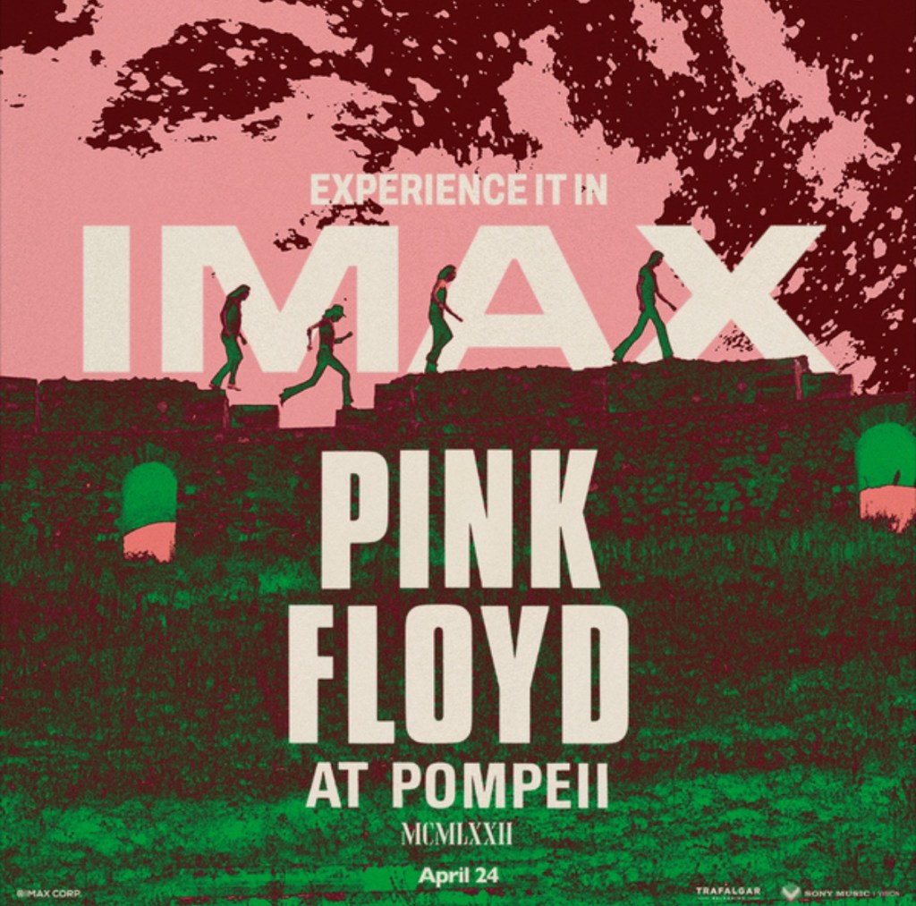 A couple of things. The film has been cleaned up and is presented in 4K resolution, which looks magnificent on the IMAX screen. The clarity and resolution were awesome, the color popped and the sound was clear and vibrant. Directed by Adrian Maben, featuring the band performing in the ancient Roman amphitheater of Pompeii, Italy.