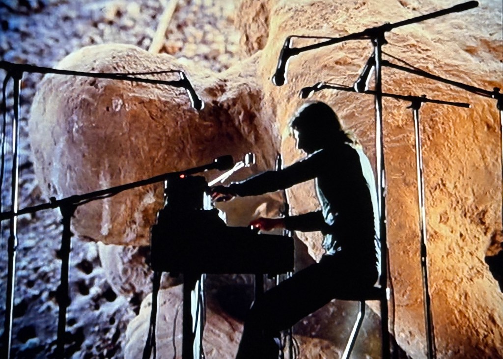 What I enjoy about this film, beyond the incredible music are moments. The snippets of dialogue are revealing. There’s an underlying bite to their humor, worldly, yet a bit naive about the musical universe. Each member of Pink Floyd is seen in their element. Nick Mason is the anchor with his percussion and dynamic style. That might be why the camera loves him. Roger Waters bounds from the large gong to his bass to the recording studio synthesizer, it’s obvious that he thinks on a huge musical canvass. David Gilmour shines on his otherworldly guitar playing; slide, sound efforts, penetrating solos – he does so without the NFL touchdown type theatrics. Richard Wright, still a creative force in the band, spinning beautiful textures, his ethereal vocals and plaintive piano chords, he’s more of a specter than a human band member.