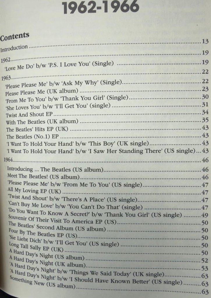 The Beatles were known for an incredible output of material in the seven or so years they recorded and released music as a band. The book is organized by year and lists each single, LP and EP released, and the variations between each. Until Sgt. Pepper, UK and U.S. albums contained different lists of songs and running orders. The U.S. approach was to include non-album singles on album releases and squeeze a few more albums from the versions released in the UK.
