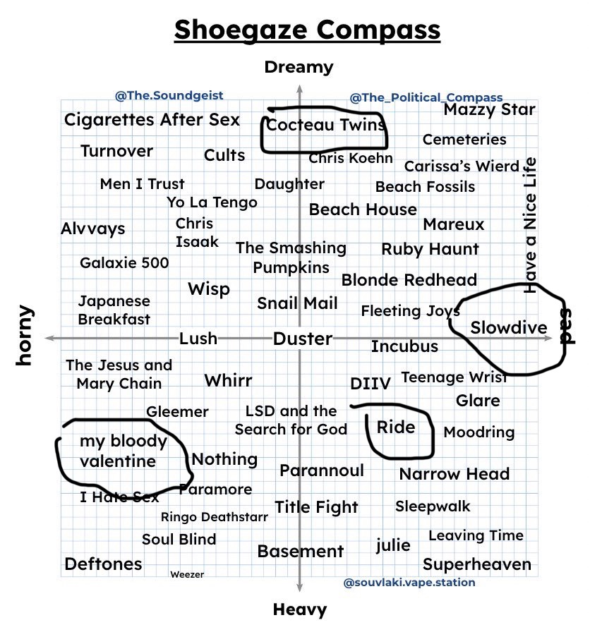 From the Eagle newspaper: “The term ‘shoegaze,’ or ‘shoegazing,’ comes from a label that music reviewers gave to bands in this scene. Originally intended to be an insult, the term is meant to describe the performing habits of “shoe-gazing”artists, where band members would stand on stage motionlessly, staring at their shoes — more specifically at their guitar pedals — in deep concentration.” Why were they concentrating so intently? Their music was spacey, ethereal, such an atmospheric wall of sound from effects pedals, that these artists are consumed by it and ignore the audience. This is not my definition, but I know of the music, and now there’s a name for it.
